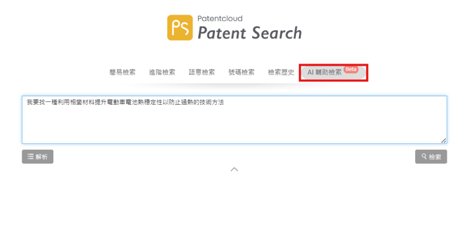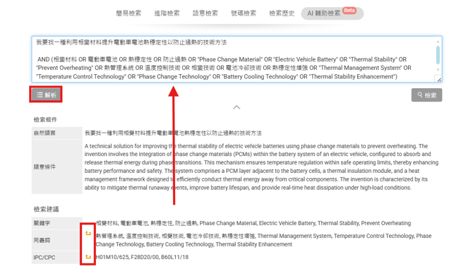 另外,可以進一步點擊 「解析」 按鈕,系統將透過 AI 分析輸入內容,並在下方 「檢索建議」 區域生成相關檢索建議。